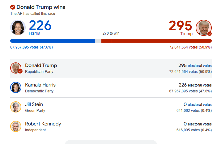 The President-elect edged out incumbent Vice President and Democratic Presidential candidate, tKamala Harris with 294 electoral votes to her 223.